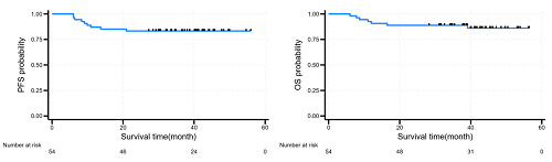 图3. PFS(左)和OS(右)的K-M曲线